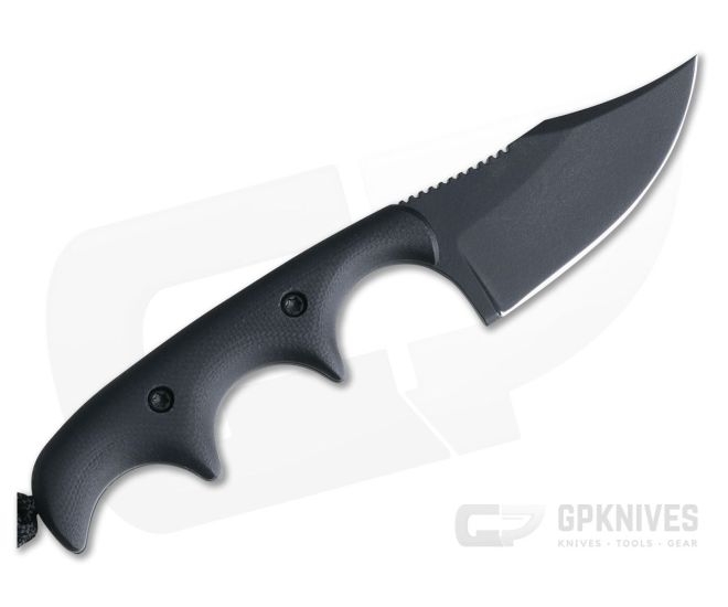 Handle: Three deep finger grooves and attached lanyard create a secure and ergonomic grip. The addition of the lanyard extends the 3-finger grip to fill most hands. Blasted and contoured Black G10 handle scales are attached via Torx screw hardware and provide a secure, high traction grip rounding out the stealth aesthetic of this piece.