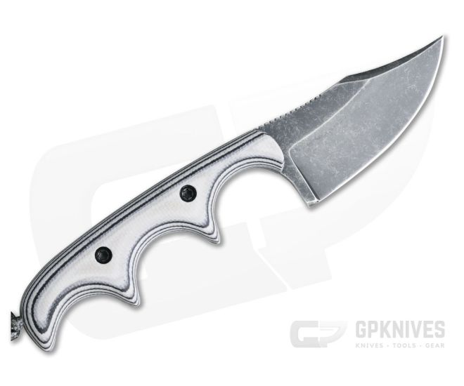 Handle: Three deep finger grooves and attached lanyard create a secure and ergonomic grip. The addition of the lanyard extends the 3-finger grip to fill most hands. Blasted and contoured Black & White Layered G10 handle scales are attached via Torx screw hardware over black liners and provide a secure, high traction grip with striking visual appeal.