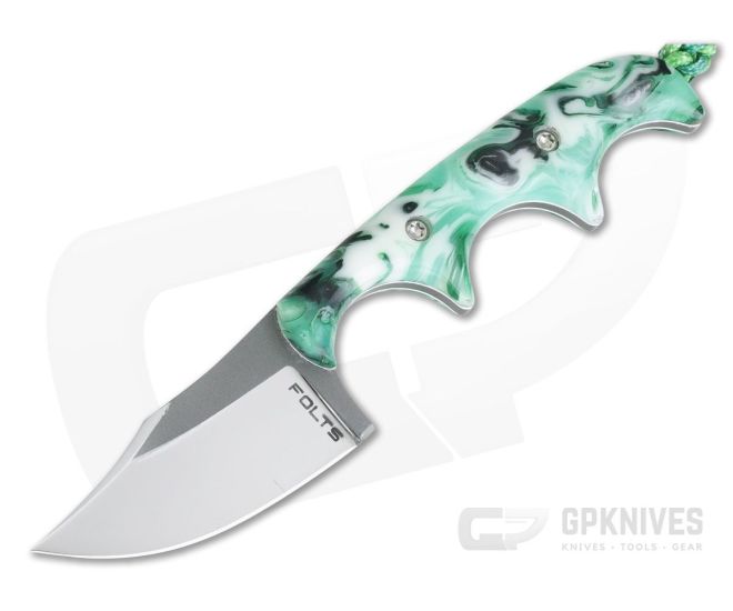 Alan Folts Custom Minimalist Bowie is a small everyday carry fixed blade made to be minimal in size (hence the name) while offering maximum function. The lightweight, well-balanced design doesn’t take up much space making it a perfect choice for discreet every day carry. This version comes with a two-tone polished and blasted, CPM-154 Bowie blade and custom green and white swirl Acrylic handles.