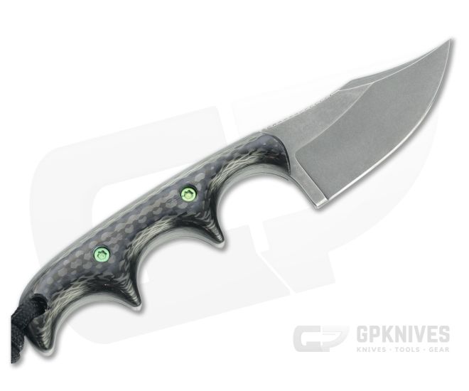 Alan Folts Custom Minimalist is a small everyday carry fixed blade made for maximum function with minimal size. The lightweight, well-balanced design has a small footprint, making it a perfect choice for discreet everyday carry. This version comes with carbon fiber scales, green anodized titanium hardware and a tumbled CPM-154 Bowie blade.
