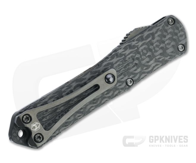 The Heretic Knives Manticore-S is the smallest of the Manticore Series of double action, out the front, automatic knives. The scaled down Manticore-S has the same contoured aircraft grade aluminum handle with traction scallops and fluting for a stylish look, secure grip and compact carry. This Bowie version comes with a stonewashed black DLC coated Elmax blade, black frame and twill carbon fiber back cover.