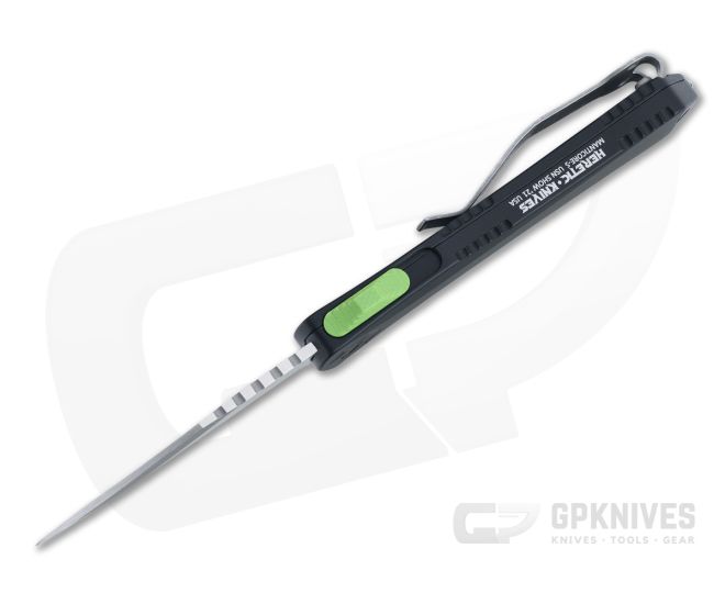 The Heretic Knives Manticore-S is the smallest of the Manticore Series of double action, out-the-front, automatic knives. Scaled down for easy of carry, this design retains the same contoured aircraft grade aluminum handle design. This USN Gathering 2021 show special has a two-tone Battleworn Elmax Bowie blade, black handle and toxic green G10 button.