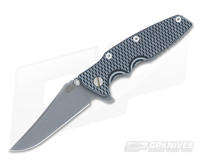 Generation 2 DLC (Diamond-Like Carbon) coated version of the Eklipse Flipper from Rick Hinderer Knives sporting a Gray/Black layered G10 handle scale and premium CPM-S35VN blade steel. This second gen has a larger overall frame than the first gen allowing for a wider variety of blade styles. This one, in particular, is ground to a Bowie trailing-point style razor sharp with a Gray DLC finish.