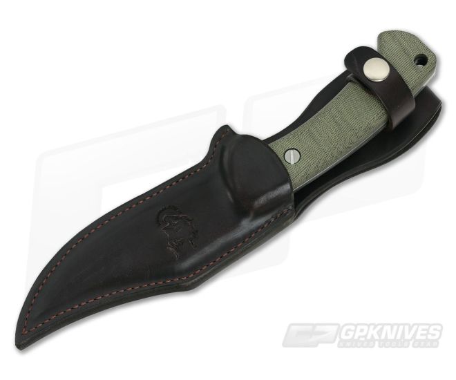 Handle & Sheath: Beefy, 3D Machined Green Canvas Micarta handles fill the hand in any grip and offer a secure and ergonomic handle without the need for aggressive traction. A “bird’s head” style pommel that allows for a secure “pinky” finger grip that enhances control and security in the hand. The handle is attached with sturdy flat head bolts that allow for easy removal of the scales for cleaning and maintenance. A generous hole is provided for lanyard attachment.