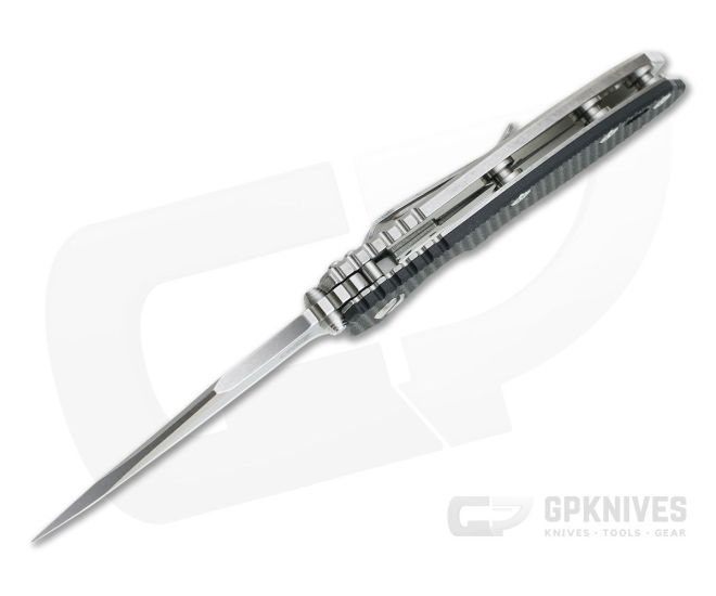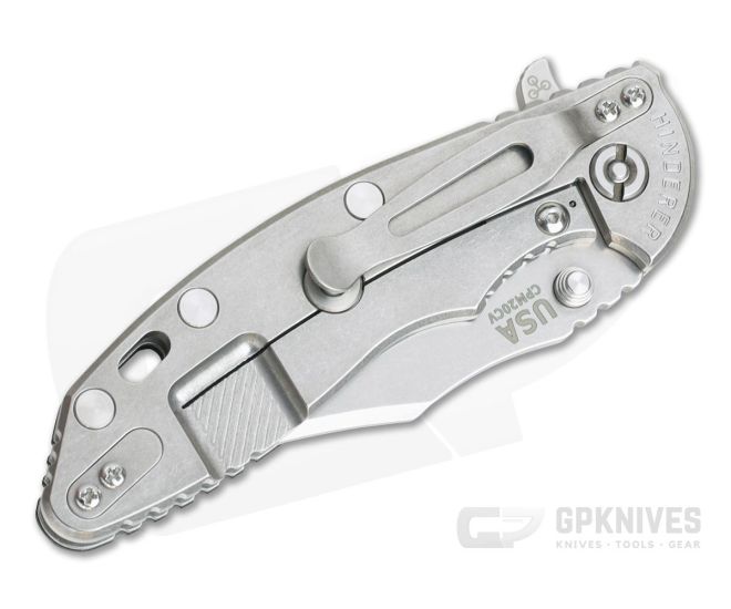 Handle: Full titanium frame lock and liner have a matching stonewashed finish that hides wear while retaining a striking visual appeal over time. Satin Hardware and standoffs create one solid package while a 3D textured G10 scale coupled with strategically placed jimping provides a solid grip. A blade choil allows for a more forward grip for controlled work. Additional features include the Hinderer Lockbar Stabilizer, titanium clip insert and customizable modular design.