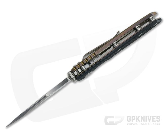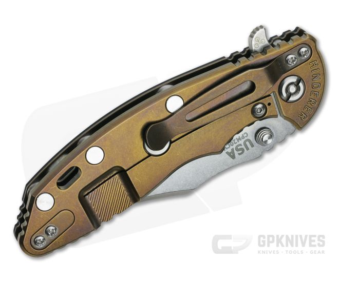 Handle: Full titanium frame lock and liner have a matching stonewashed and bronze anodized finish for a rugged, wear hiding look with stunning visual appeal. Satin Hardware and standoffs create one solid package while a 3D textured G10 scale coupled with strategically placed jimping provides a solid grip. A blade choil allows for a more forward grip for controlled work. Additional features include the Hinderer Lockbar Stabilizer, titanium clip insert and customizable modular design.