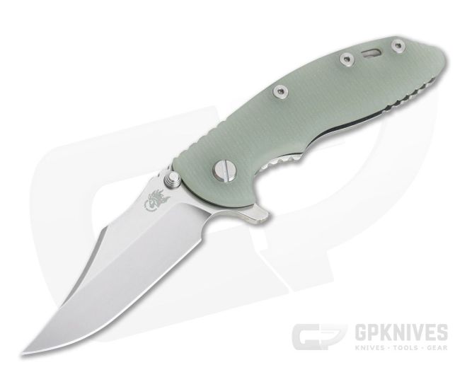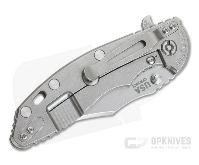 Handle: Full titanium frame lock and liner have a matching stonewashed finish that hides wear while retaining a striking visual appeal over time. Satin Hardware and standoffs create one solid package while a 3D textured G10 scale coupled with strategically placed jimping provides a solid grip. A blade choil allows for a more forward grip for controlled work. Additional features include the Hinderer Lockbar Stabilizer, titanium clip insert and customizable modular design.