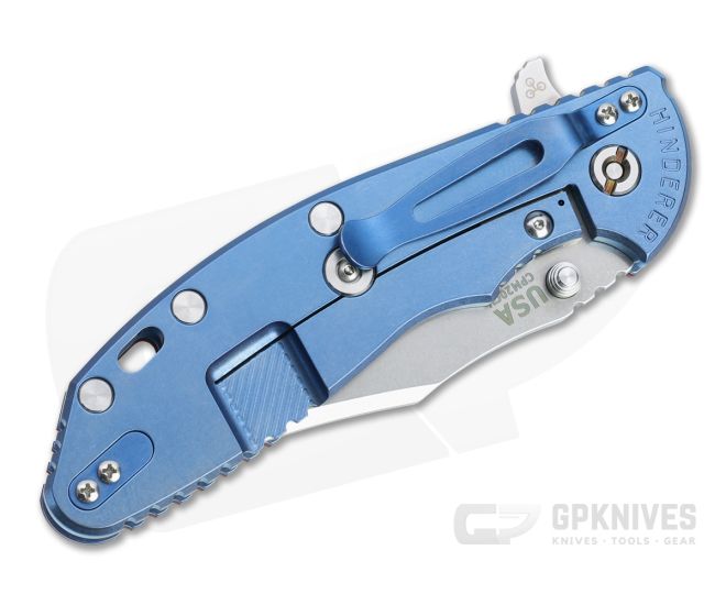 Handle: Titanium frame and liner come in a matching stonewashed blue that hides wear with style while the textured G10 scale and jimping provide a secure grip for large hands and gloved users. Equipped with a steel lock face insert, the integral frame lock has solid lockup and smooth operation for safe use. The Hinderer LockBar Stabilizer, titanium clip insert and hardware make this a fully customizable modular design.