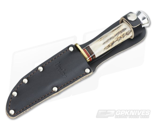 Linder Medium Traveller with one piece genuine stag handle and aluminum pommel. German made Bowie blade of 420 stainless steel with a machined satin finish. Multi piece handle has a brass guard and is tensioned with a brass nut recessed into the aluminum pommel. Nicely made excellent fit and finish. Includes a riveted and sewn brown leather belt sheath with snap strap.
