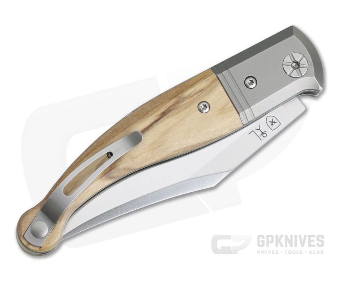 Handle: The Navaja-inspired design has a similar sweeping handle with titanium bolstered Olive Wood scales supported by crowned titanium liners. The back-spring is crowned and, along with the chamfered scales and bolsters, offer a very comfortable feel in the hand. The tapering handle provides a solid and secure grip while a subtle index guard provides some added safety. The moderate back spring tension delivers smooth pull with snappy half and full stops for secure use.