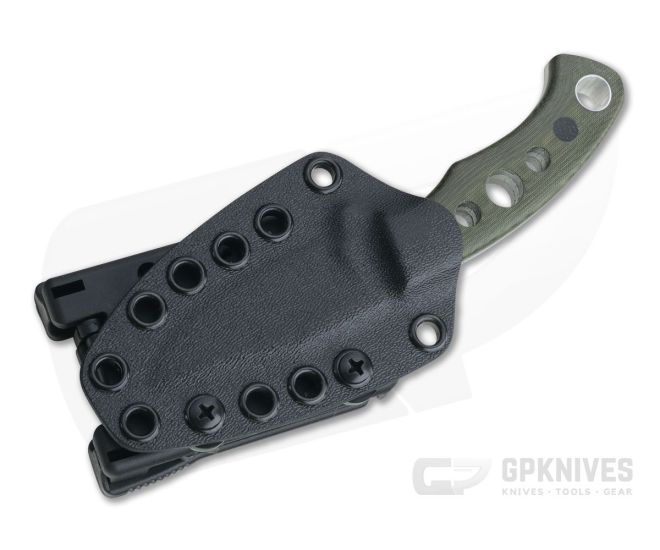 Handle: Ergonomically designed, polished Green Linen Micarta handle scales are contoured for unparalleled comfort in the hand with speed hole milling for enhanced traction. Shaped with two subtle finger grooves, the handle design locks the hand in without compromising versatility for multiple grips. The scales are attached via two black Micarta pins and a hollow lanyard tube.